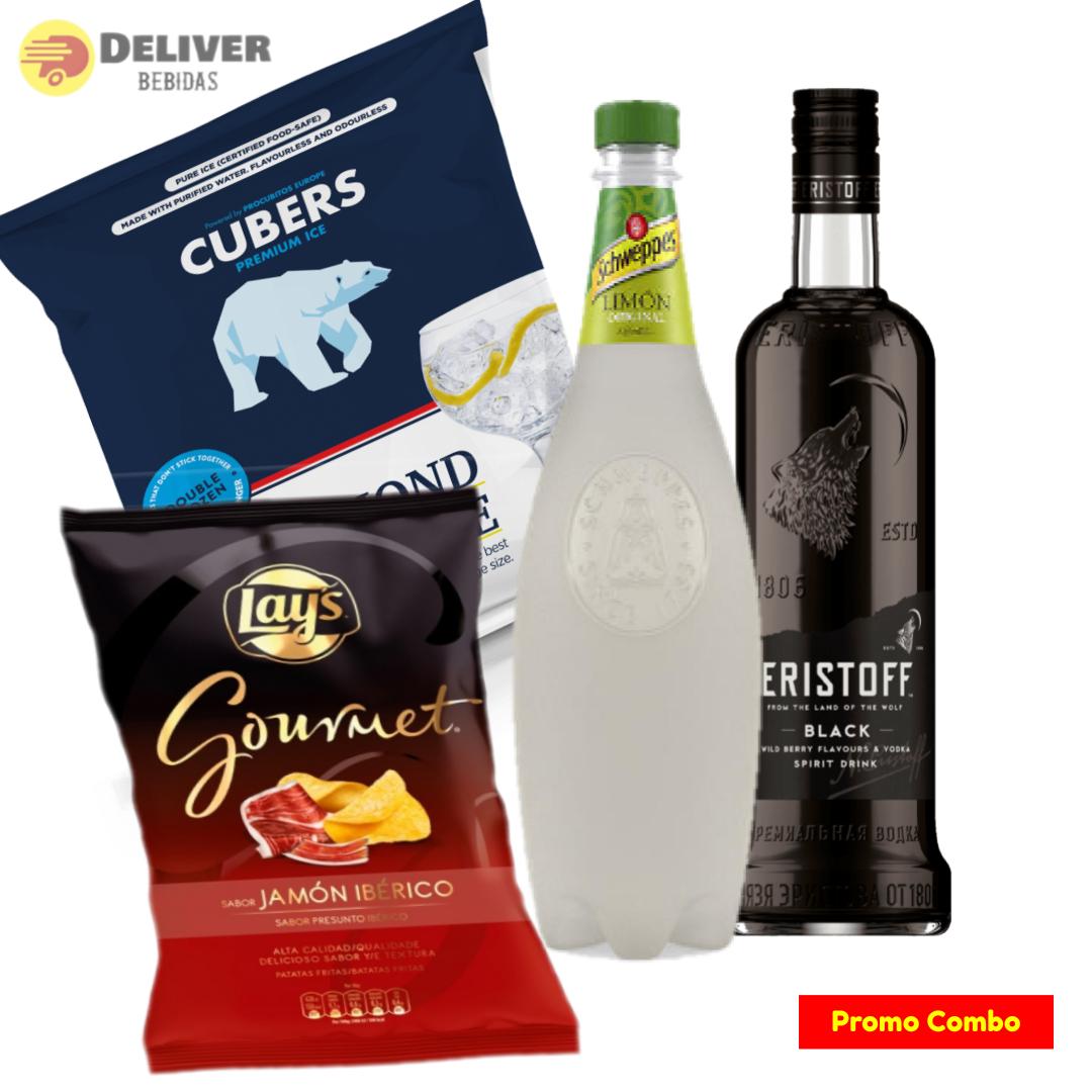 Eristoff Black Promo pack con Envío gratis y servicio de entrega urgente en Madrid y con todo lo que necesitas para disfrutar de tu bebida.También puedes elegir el refresco de tu preferencia entre Coca Cola sabor original, Zero, Schweppes, o Sprite.